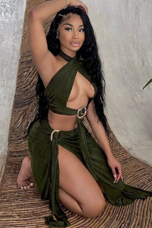 Money Green Baddie Two-Piece Velvet Halter Maxi Skirt Set