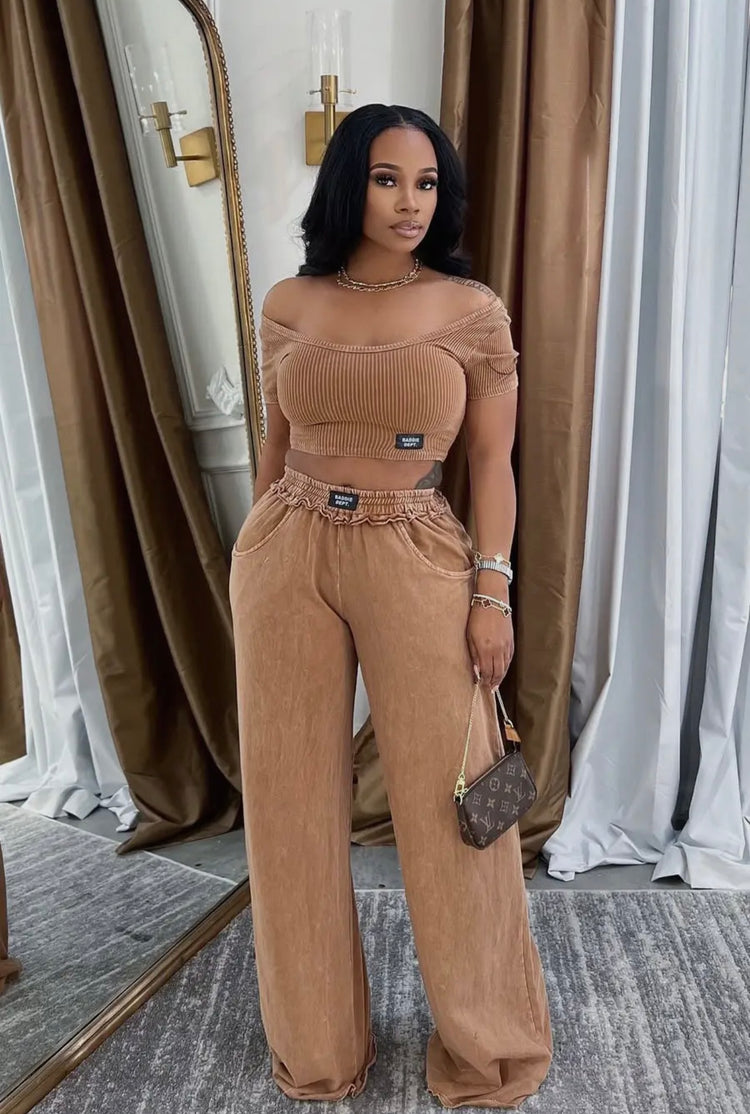 Description: Experience the ultimate comfort and style with our Baddie Dept Set. Made with mineral wash fabric, this set includes a cropped short sleeve top and wide leg sweat pants with elastic waistband for a perfect fit. Complete with a black satin label detail and stretch for a bodycon look. Perfect for any fashion-forward Baddie.