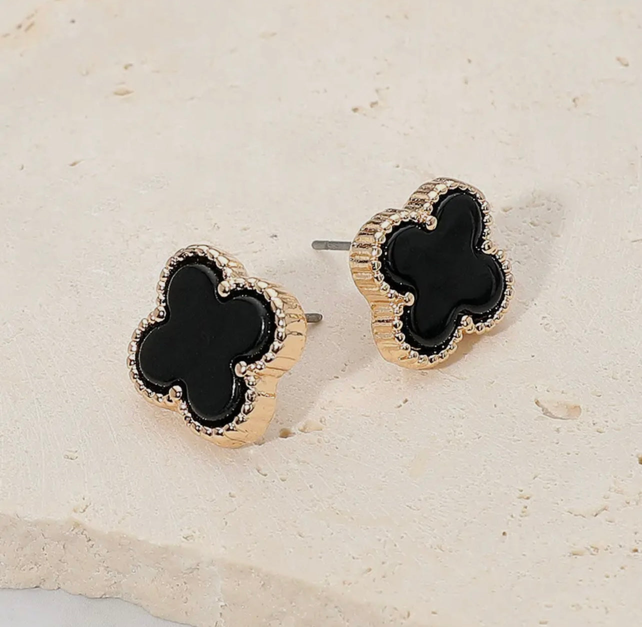 Upgrade your style game with our Baddie Lucky Earrings. These chic stud earrings feature a timeless quatrefoil shape with textured trim, perfect for any occasion. The post back ensures a secure fit, and they are lead and nickel compliant, making them safe for sensitive ears. Size 0.6” X 0.6”. Elevate your look with these lucky earrings.