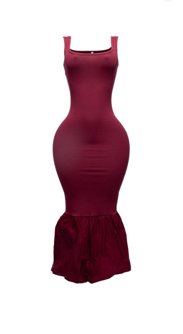 Description: sleeveless, stretchy, square neck, mermaid body, bubble hem