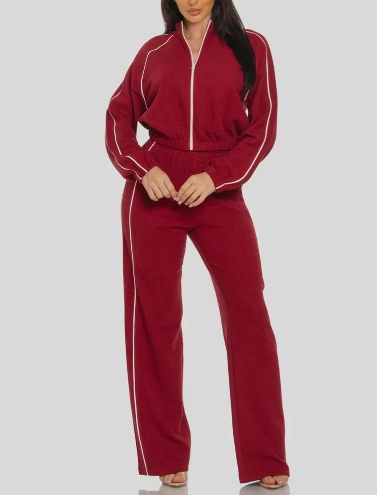 Description: The Pheadra Baddie Set is a stylish and comfortable outfit that features a texture knit contrast front zip up jacket top and flare pants. The elastic waistband and pipping stripes detail provide a flattering fit, while the mixture of polyester, Rayon, and Spandex materials offer both durability and flexibility.