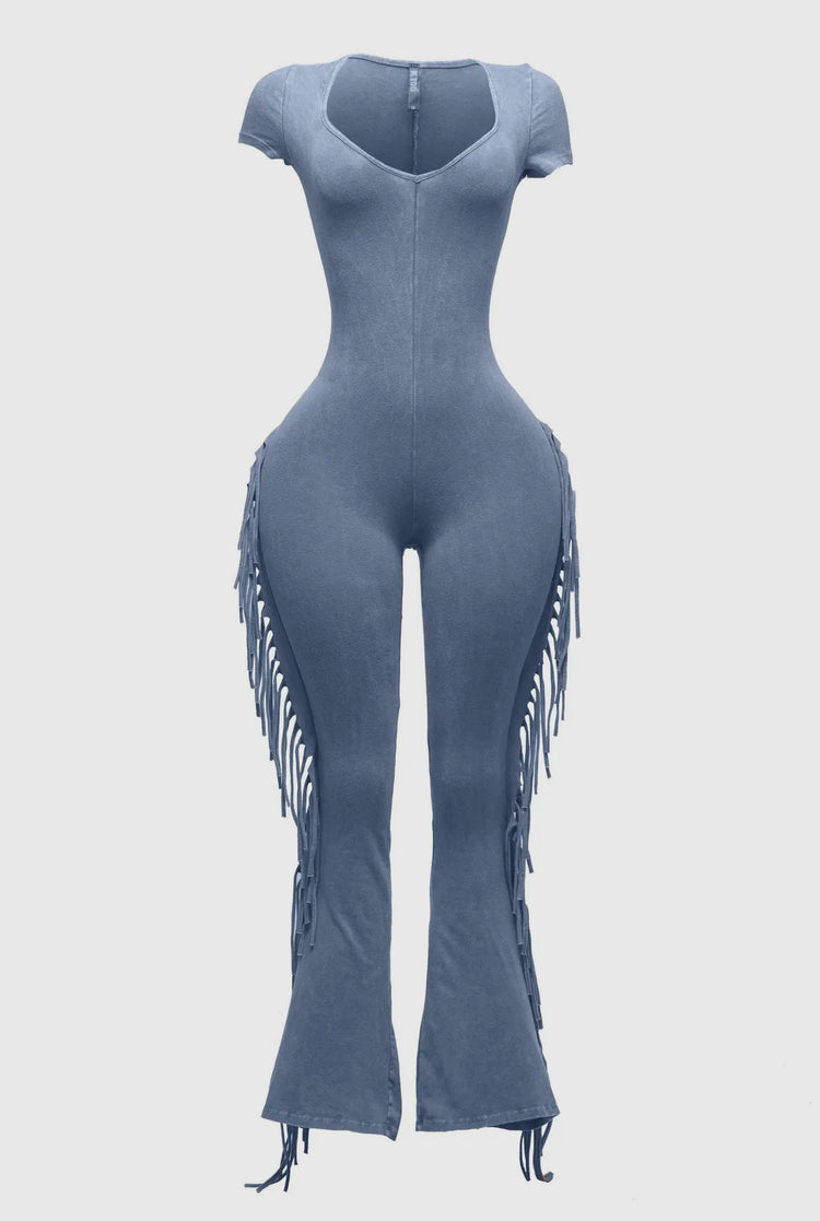 Description: Unleash your inner baddie with the Reba Baddie Jumpsuit. Made with a specialized wash and printing process, each garment is unique. This scoop neck jumpsuit features short sleeves, a straight hem, and a bodycon fit that hugs your curves. With 95% cotton and 5% Spandex, it also offers stretch for ultimate comfort. Don't miss the side fringe detail for an added touch of flair. Perfect for those who want to make a statement.